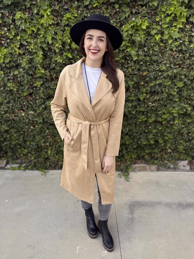 Wrap yourself in sophistication with the Liliane Moleskin Coat. Its lapel neckline, raw-edged belt loops, and raw-edge pocket opening exude flawless charm. At the same time, the center back seam adds a classic touch. She is a never-before-seen style for LuLaRoe and an exquisite addition to the LUXE Collection. Fabric: Moleskin Suede - 95% Poly / 5% Span Sizes: XXS - 3XL